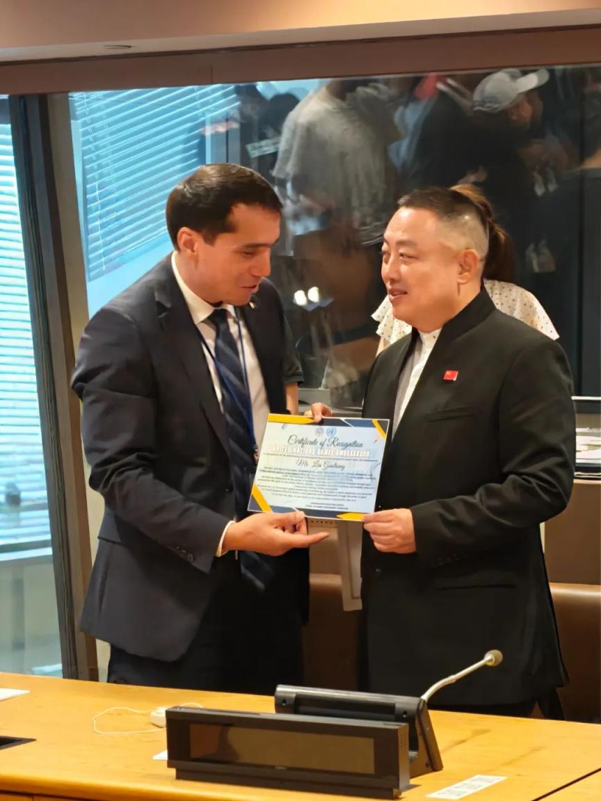 当地时间6 月 12 日,国际乒联第一副主席、WTT 世界乒联董事会主席刘国梁亮相美国纽约联合国总部,获颁联合国运动会亲善大使证书,并出席首届联合国儿童乒乓球友谊赛。